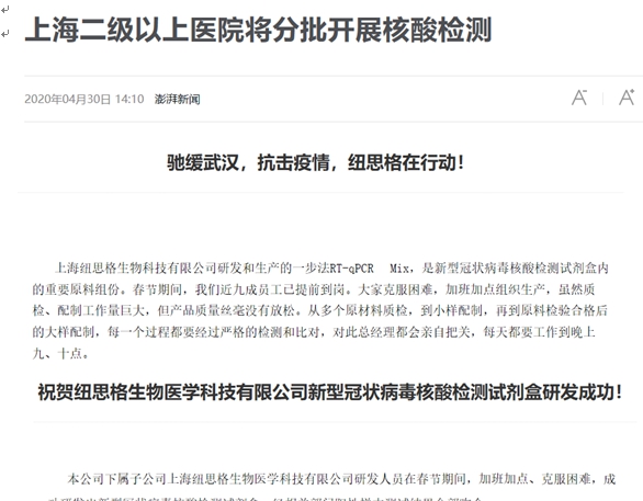 我司戰(zhàn)略合作伙伴紐思格生物充分發(fā)揮企業(yè)的優(yōu)勢,積極響應(yīng)人民需求,在疫情爆發(fā)初期就不計成本,不計付出投入各種酶、Master Mix和核酸提取試劑的生產(chǎn)研發(fā),經(jīng)過全體員工夜以繼日的努力,紐思格于2月7日宣布新型冠狀病毒核酸檢測試劑盒研發(fā)成功,為抗擊疫情奉獻綿薄之力。