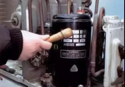 一般選擇木錘或者就地選擇可用物件。在壓機啟動時重錘敲擊其身上的三個焊點。但要注意力道,不能敲變形。輕輕地敲擊壓縮機外殼,把卡住部位稍微振松,有時可啟動運轉或把電源電壓往上調高10%,多次啟動沖擊,這個方法可解決潤滑不夠的卡缸現象,對旋轉式壓縮機特別有效。