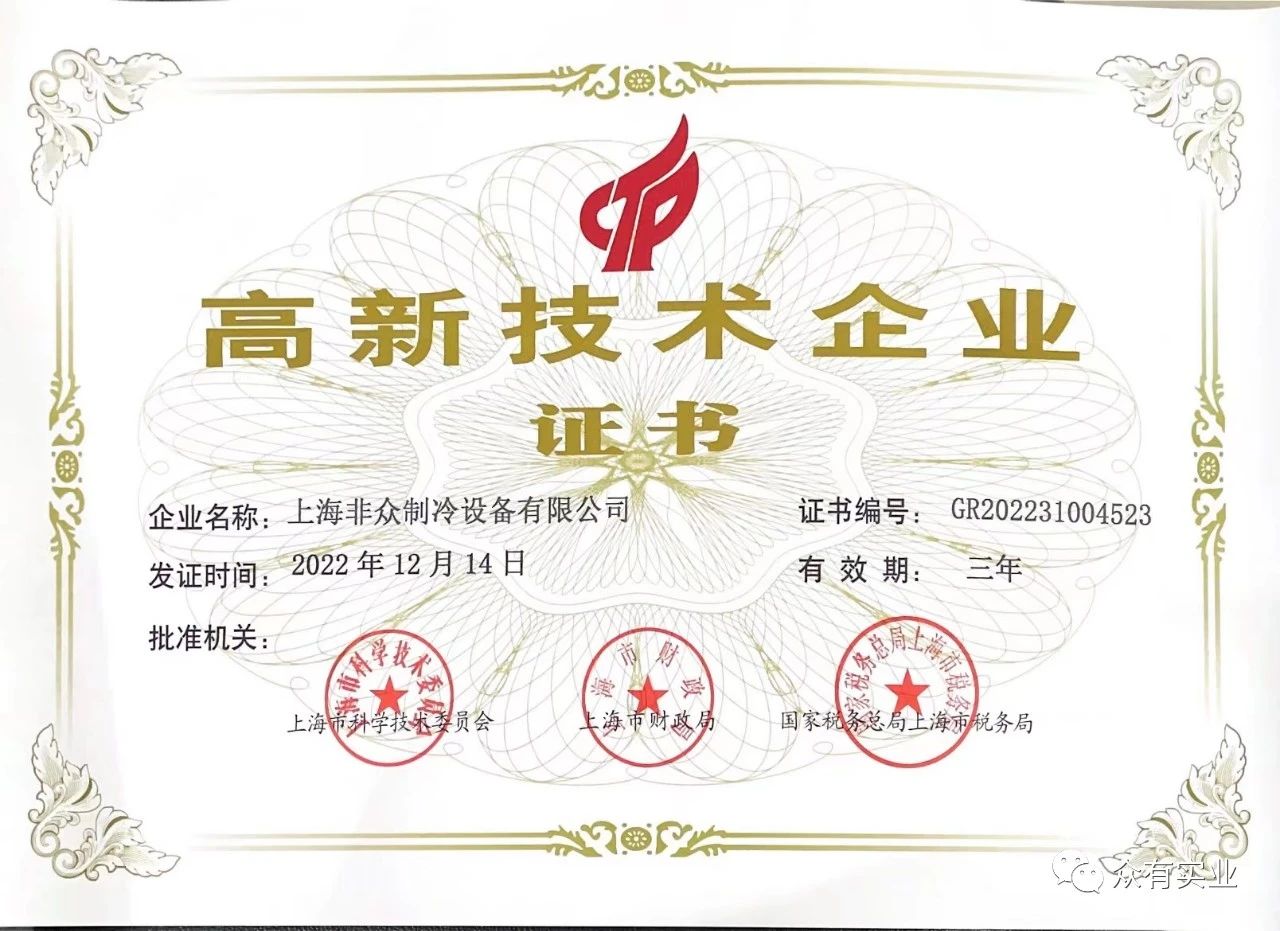 獲得高新技術(shù)企業(yè)認(rèn)證,證明了非眾制冷在本領(lǐng)域中具有較強(qiáng)的技術(shù)創(chuàng)新能力、技術(shù)開發(fā)能力。