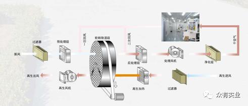 轉輪除濕機的工作流程可分幾個部分完成:預冷 / 預熱( 供選件 ) — 轉輪除濕 —后冷 / 后熱( 供選件 )
