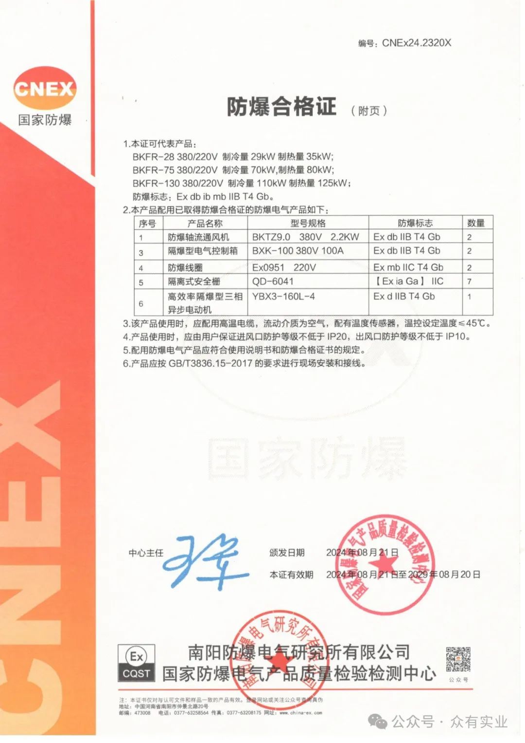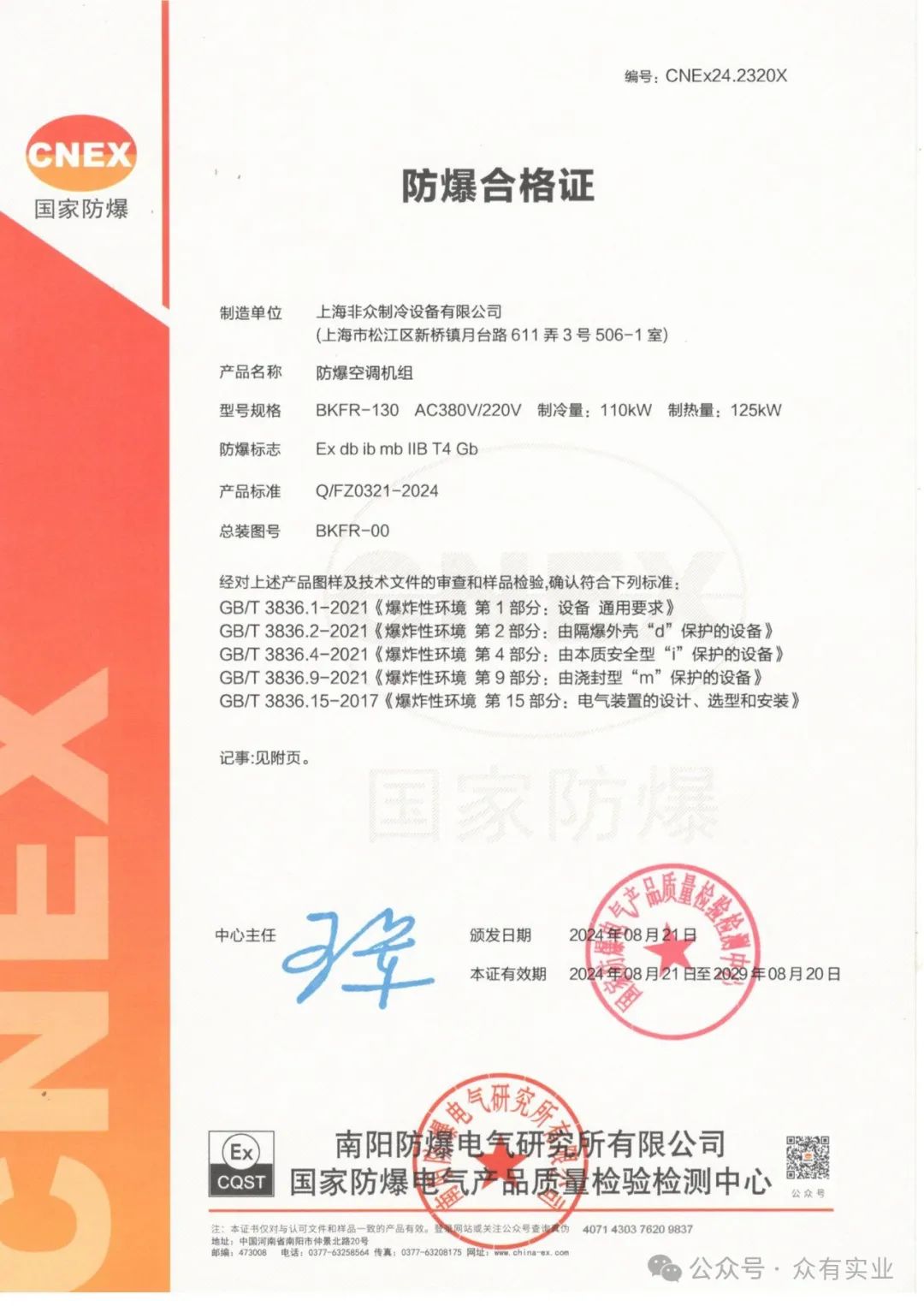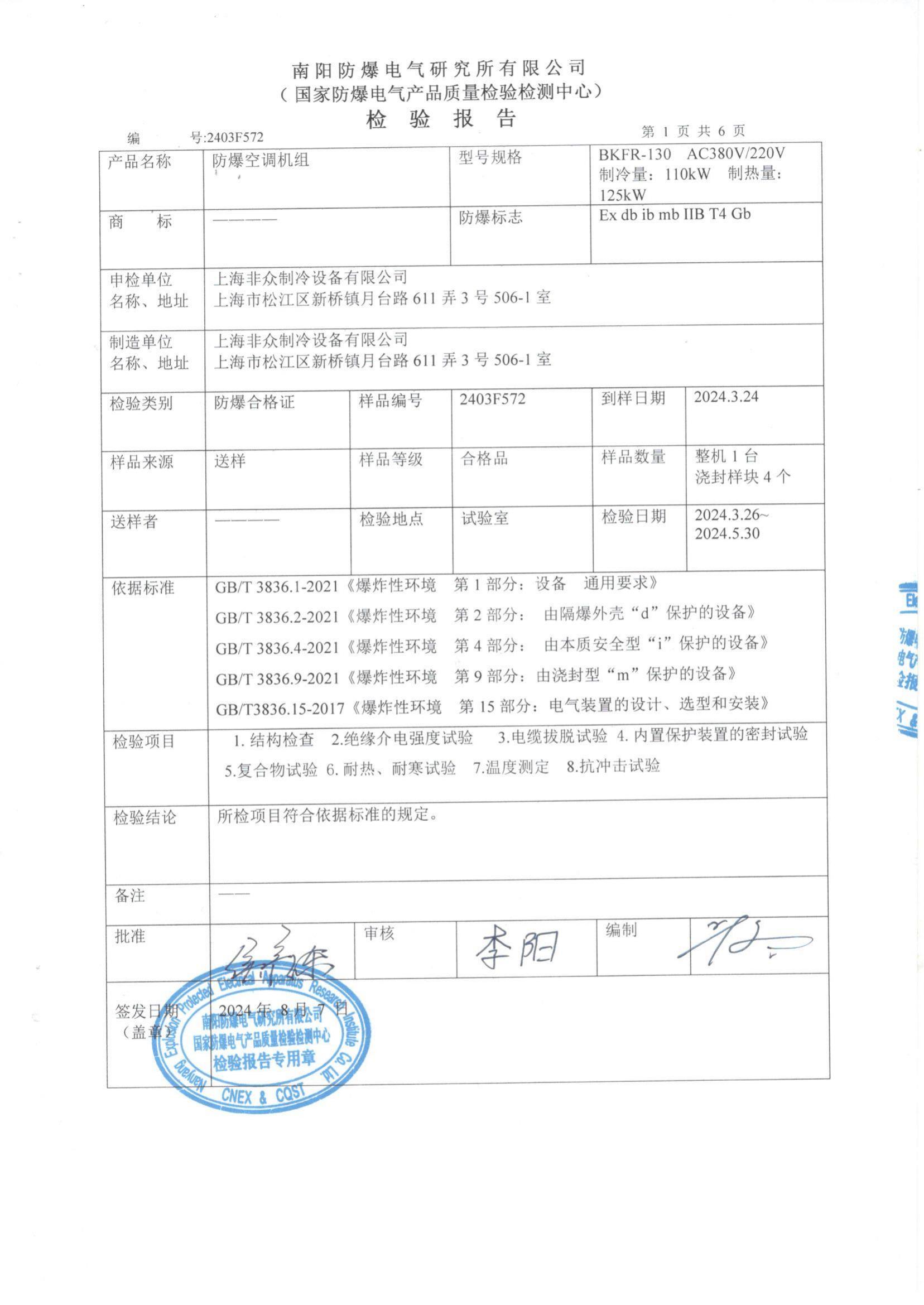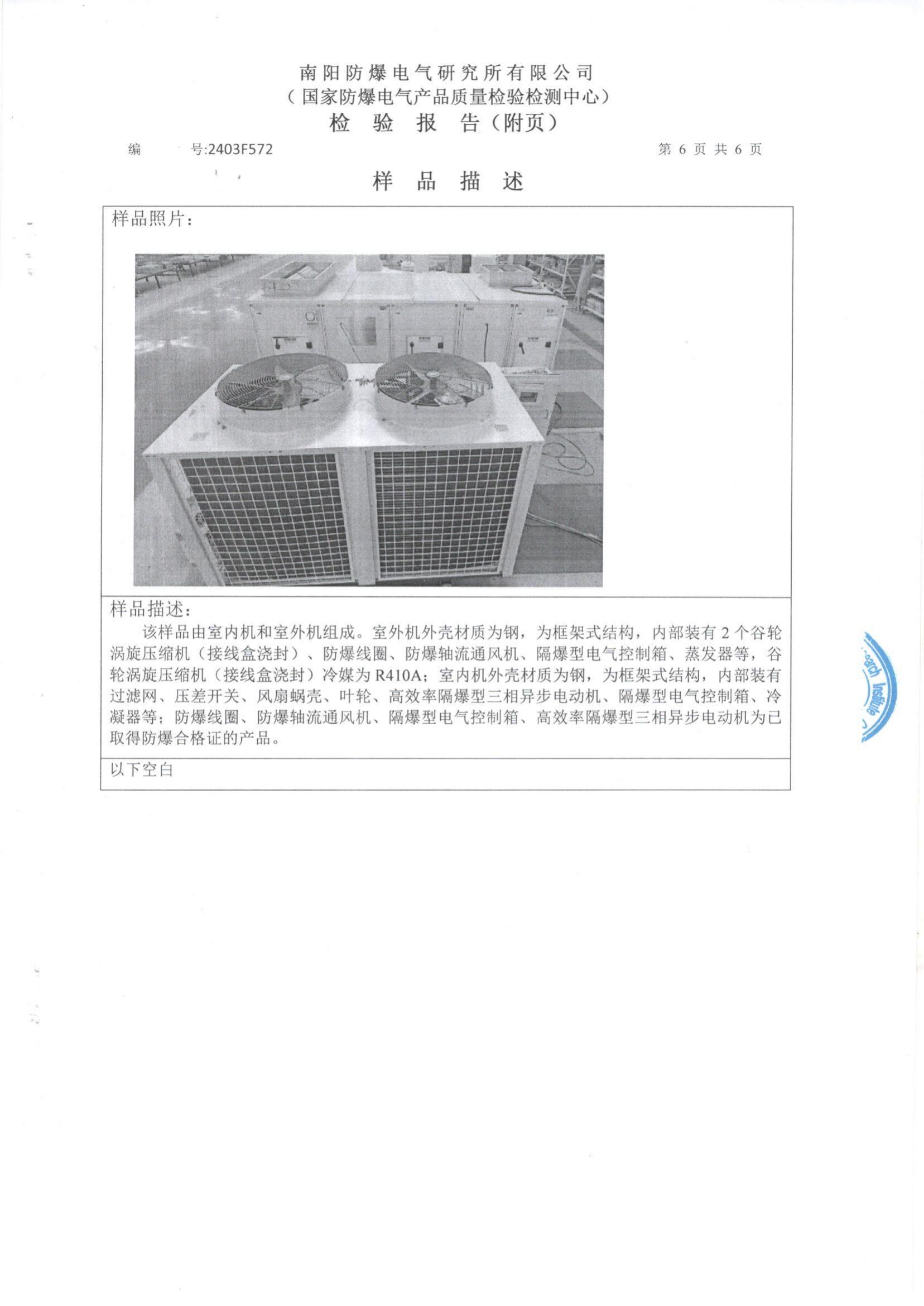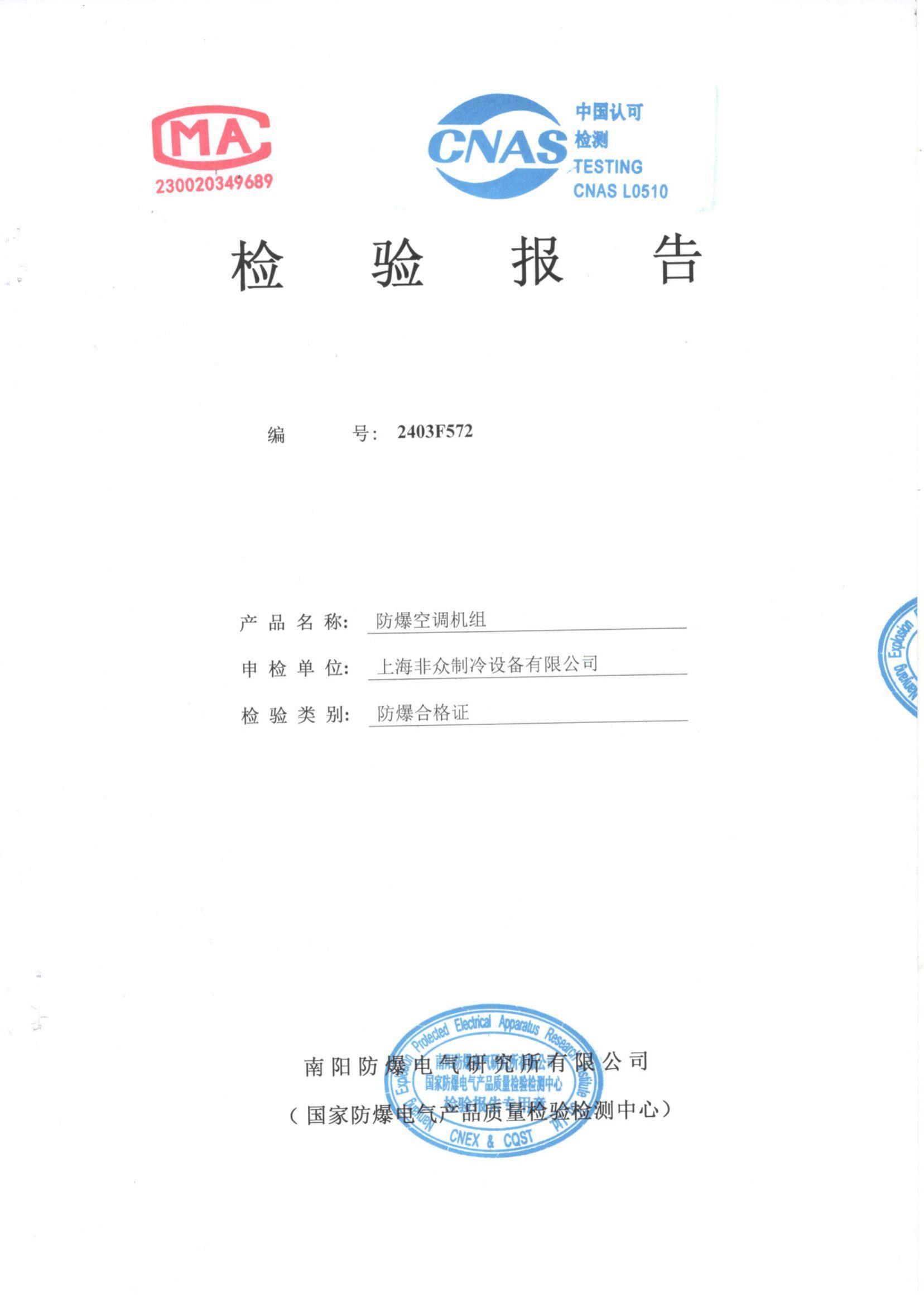 眾有防爆空調設備通過南陽防爆電氣研究所有限公司檢測(國家防爆電氣產品質量檢驗檢測中心)取得相應證書!