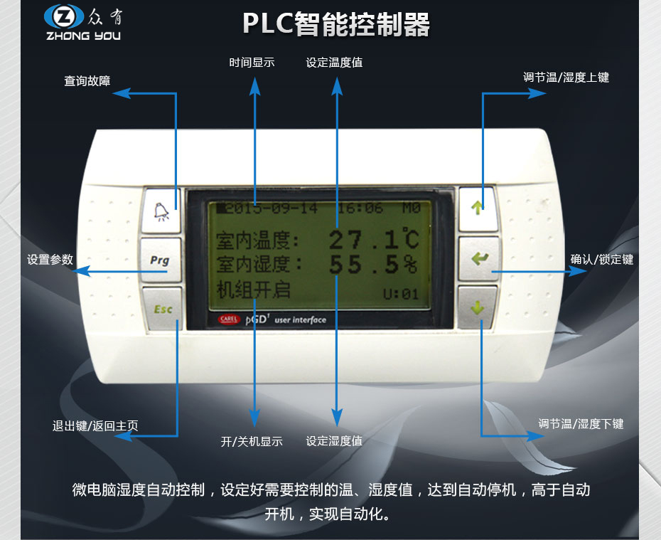6、進口微電腦精密控制器:液晶溫濕度顯示,用戶參數設定,操作簡便控制精確;高精度溫濕度傳感器,能自動實現溫濕度控制;進口名牌接觸器、繼電器等電器元件;
